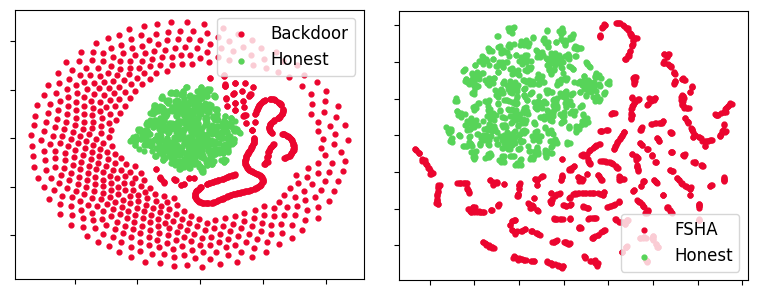 Gradients live in a very high-dimensional space, but honest and malicious gradients form very different neighborhoods. t-SNE plots show honest gradients forming a tight, dense cluster. Malicious gradients spread over a larger region and largely surround the honest cluster.
