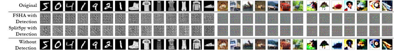 Reconstructions obtained when SplitOut is active have almost zero SSIM with the original inputs, compared to high SSIM when FSHA runs without detection.