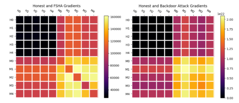 Pair-wise average L2 distances between sets of honest and malicious gradients on CIFAR-10 reveal the same picture: