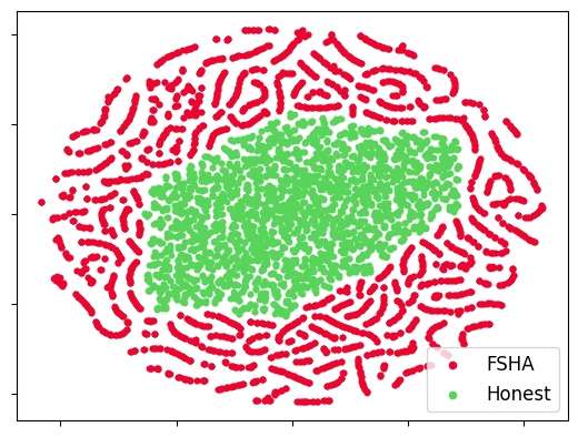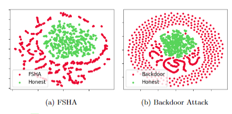 Red lines represent where the attack (FSHA) is detected.